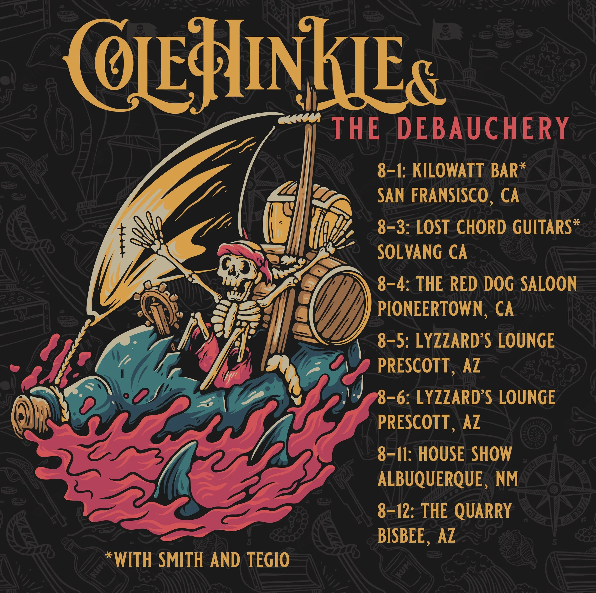 Cole Hinkle & the Debauchery are an alt-country band from California’s Tuolumne County. Hinkle’s lyrics paint a vivid yet dark picture delivered by a weathered voice, while the Debauchery creates an otherwise somber tune rambunctious and jam worthy, haunting and beautiful.