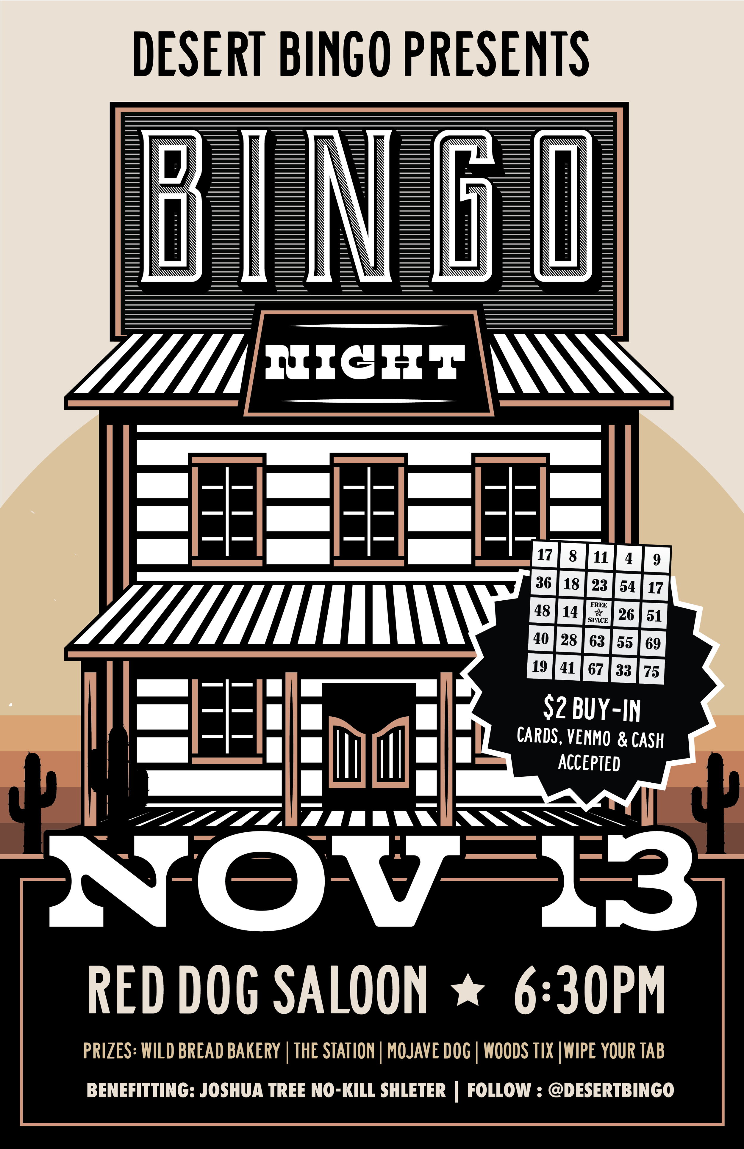 Back to All Events Desert Bingo Presents: Bingo Night Monday, November 13, 2023 6:30 PM 10:00 PM Google Calendar ICS